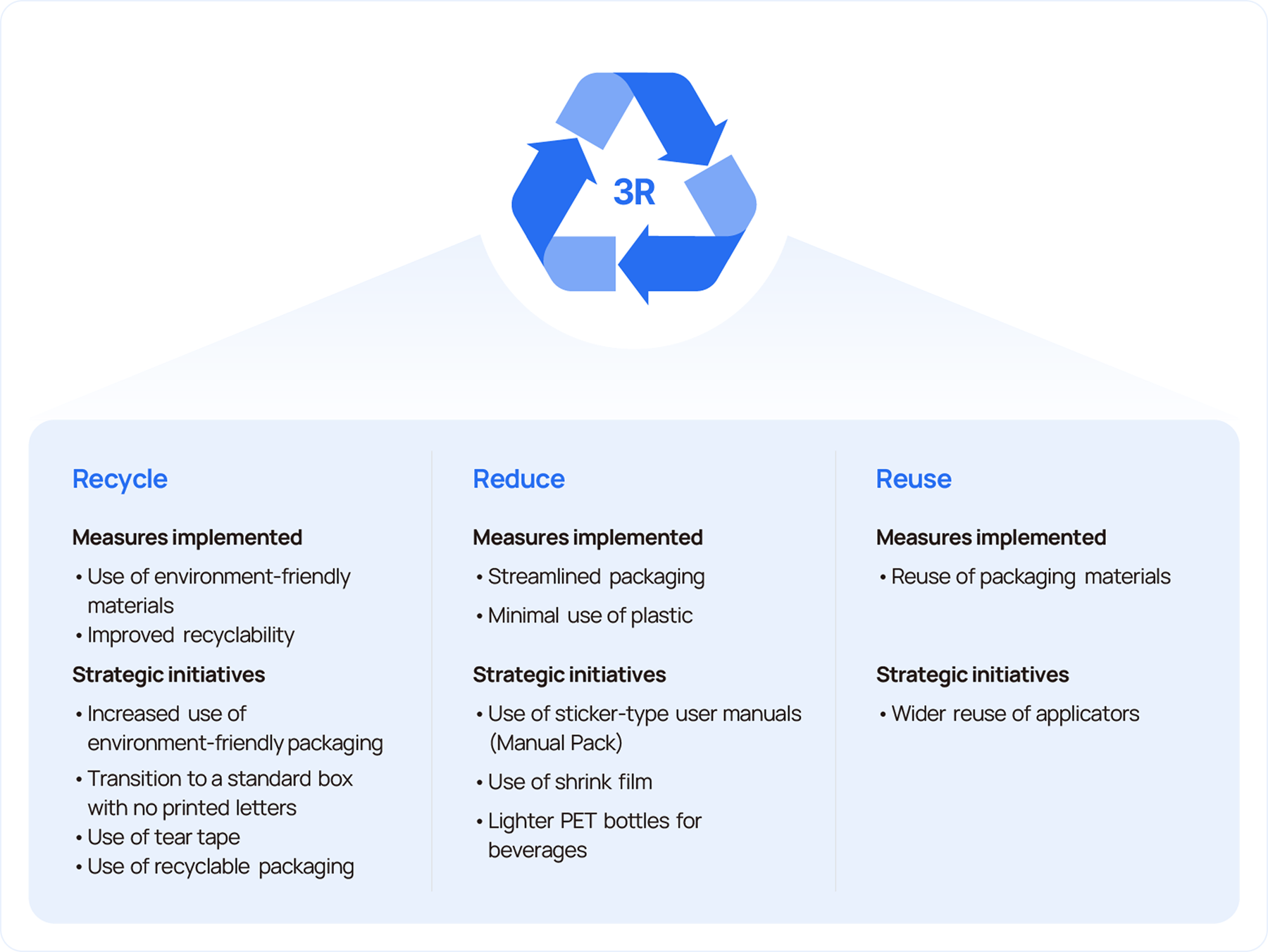 'To minimize product packaging and make packaging more environment-friendly, HK inno.N established its 3R strategy for sustainable packaging. The three R’s stand for Recycle, Reduce and Reuse. Based on this strategy plans and development are underway to improve the packaging for pharmaceutical products and H&B products (e.g. beverages and beauty products). This initiative aims at meeting customer needs for environmentfriendly products and minimizing the impact caused by waste in the product usage stage.
