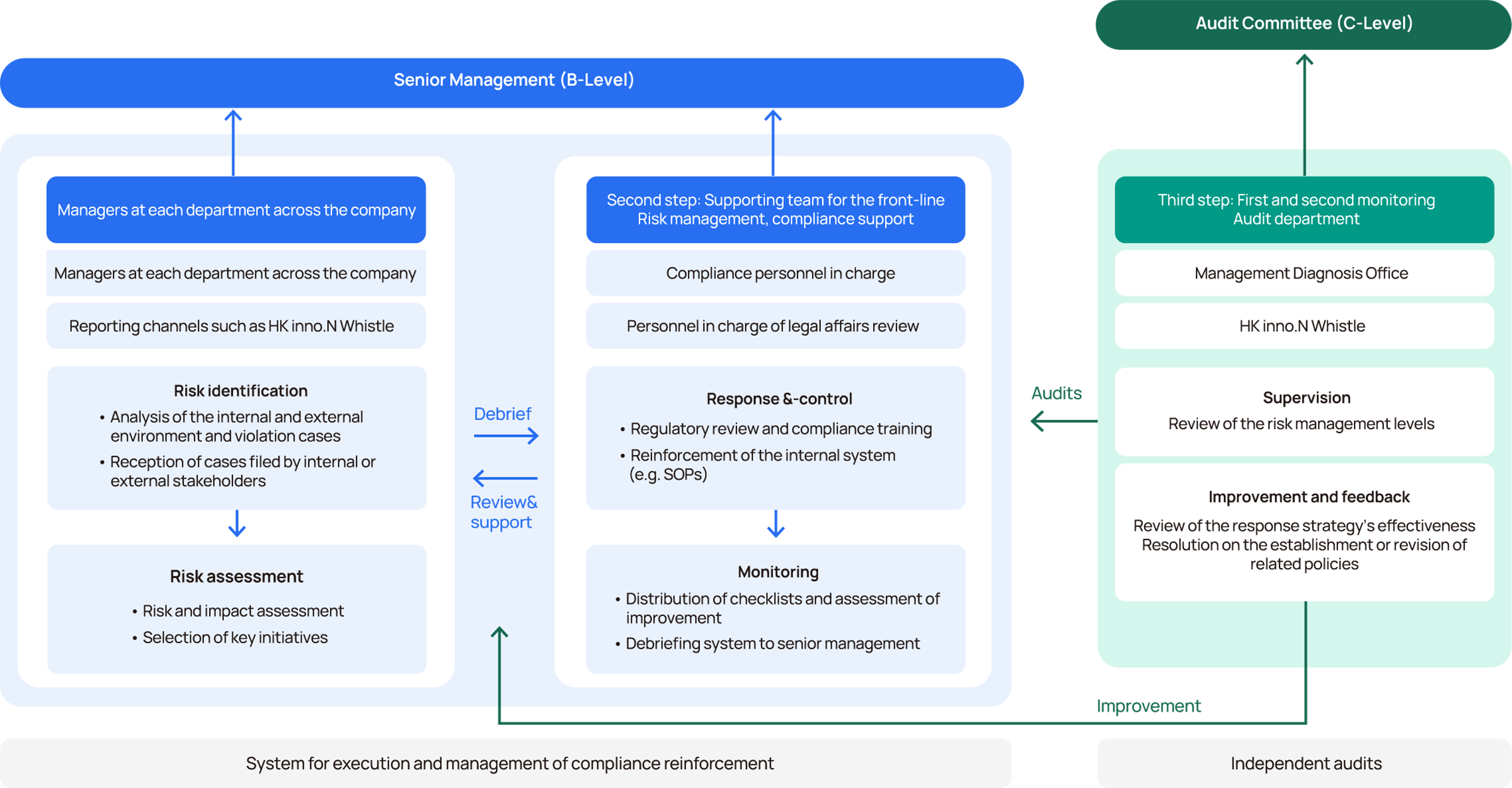 The supervision and investigation of internal audits of HK inno.N are operated by the Audit Committee, composed of independent directors, and the Management Diagnosis Office that supports the efficient operation of the Audit Committee.The criteria that apply to the compliance risk review process is defined in the Regulations for Fair Trade and Compliance Program, and further details are stipulated in the monitoring guidelines for the Program.Also, Management Diagnosis Office which manages internal audits, annually debriefs the result of internal audit based on Code of Ethics to Audit Committee under the Board of Directors. Compliance Manager conducts pre-review of Ethical Management activities across all business sites in accordance with regulations. The results of risk assessments and mitigation measures are managed as company compliance risks through final reporting to executives and Audit Committee under the Board of Directors.