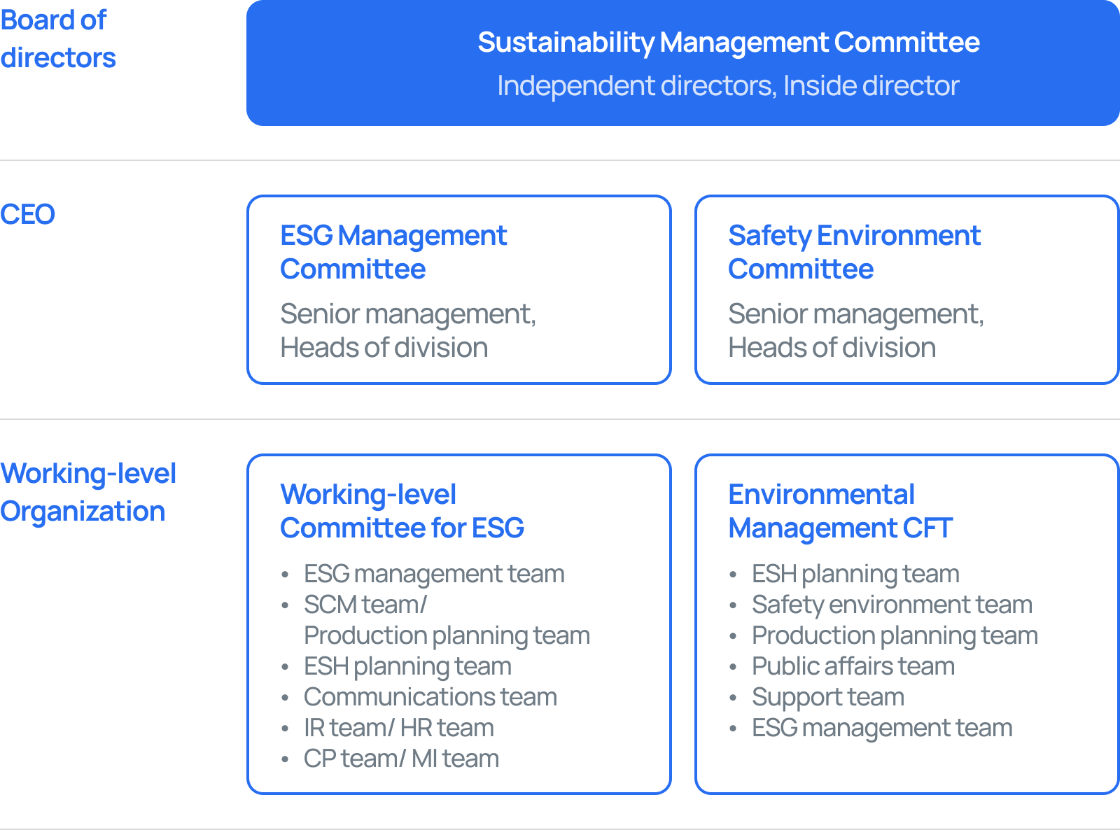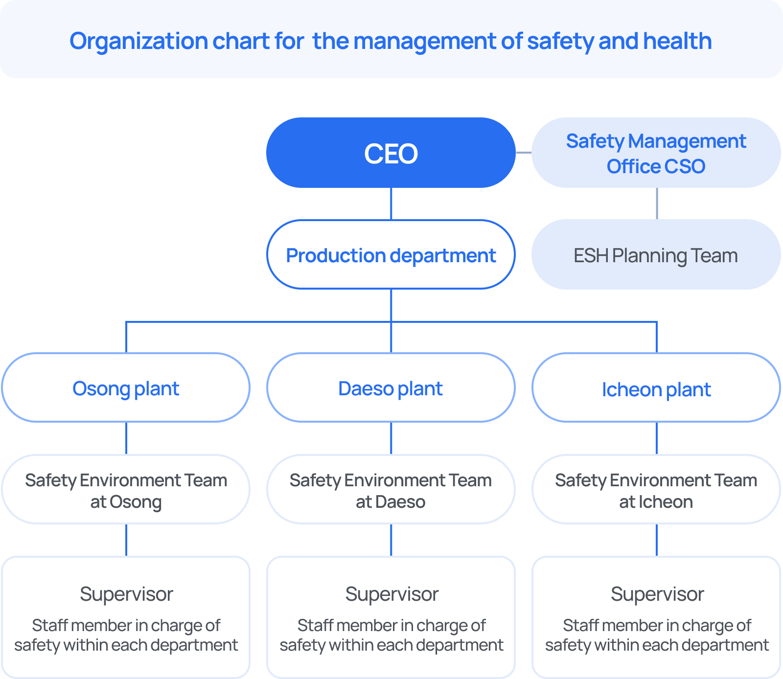 | Day of on-site safety | The CEO makes monthly visits to plants to deliver a safety management message, be debriefed on the safety and health-related issues on site and tune into the opinion of employees |
