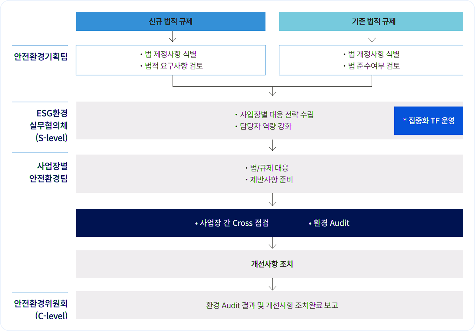 HK이노엔은 환경영향으로 인한 위험의 식별 및 관리를 목적으로 모든 제조 생산 사업장에 대해 매년 6월과 11월에 환경 Audit을 실시하고 있습니다. 사업장 간 교차 점검 및 사내 audit 실행을 통하여 법/규제 이행 준수를 모니터링하고 법적 위험을 파악하여, 그에 대한 개선 조치를 수행하였습니다. 환경 audit 시행 결과, 2022-24년 동안 총 104건(문서 42건, 현장 62건)의 조치사항을 발굴하였으며, 해당 지적 건수는 모두 조치 완료하였습니다. 또한 지적된 사항들을 각 사업장들로 수평 전개하여, 전 사업장의 환경규제에 대한 대응력을 강화하였습니다.