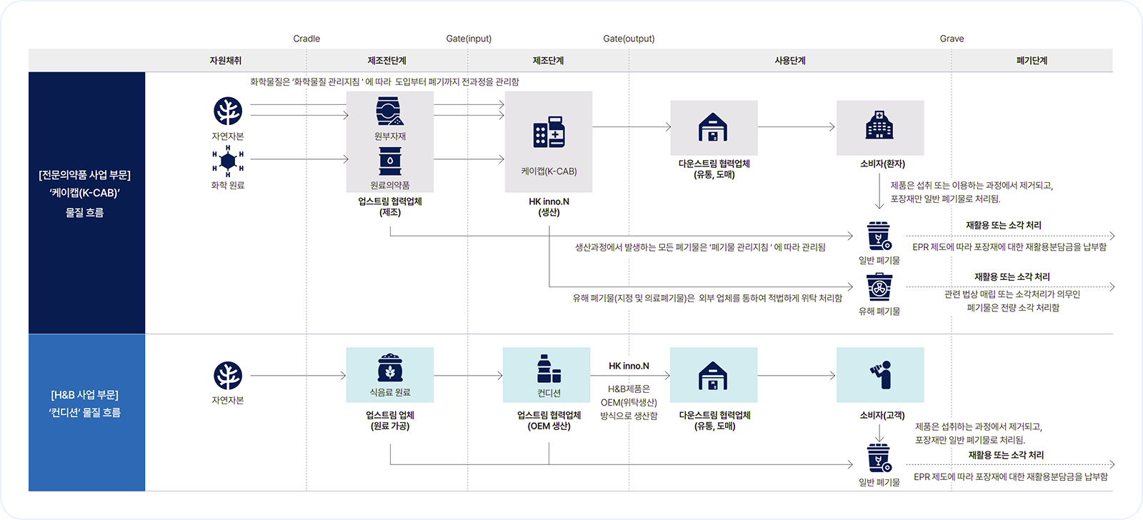 HK이노엔은 물질 흐름을 파악한 내용을 바탕으로 지속가능성 이슈를 식별합니다. 이를 바탕으로 재활용률 성과 모니터링, 폐기물 관리지침 등 자원의 올바른 사용과 처리를 관리하기 위한 내부 프로세스를 운영하고 있습니다.