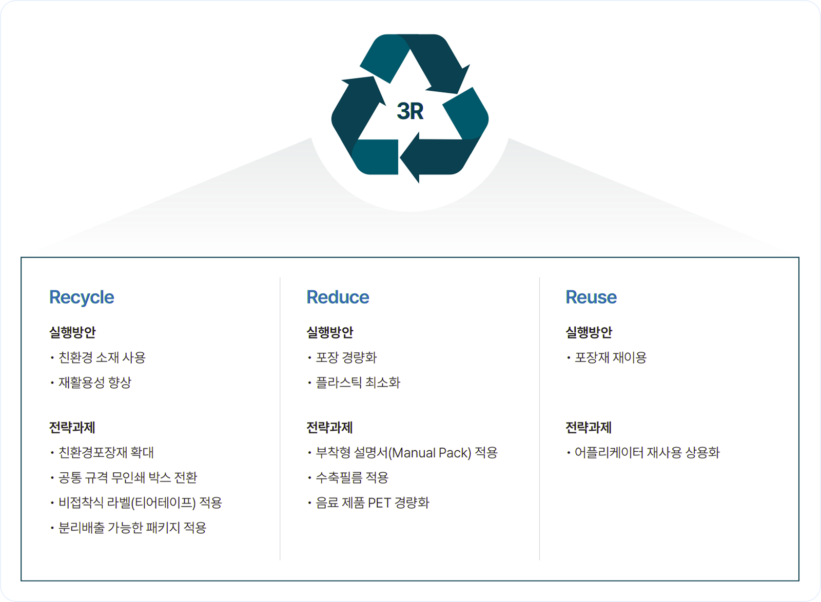 HK이노엔 제품 포장에 사용되는 자원을 최소화하고, 패키지의 환경성을 증진하고자 ‘지속가능한 패키지 3R(Recycle, Reduce, Reuse) 전략’을 수립하였습니다. 3R 전략을 기반으로 제약사업군과 H&B 사업군(음료, 뷰티 등) 제품의 패키지를 개선하기 위한 기획 및 개발을 추진하고 있으며, 완충재, 내장재 등의 2차 포장재를 축소하고 있습니다. 이를 통하여 친환경 제품에 대한 고객의 니즈를 충족하고, 고객 사용 단계에서 발생하는 폐기물로 인한 영향을 최소화하고 있습니다.
