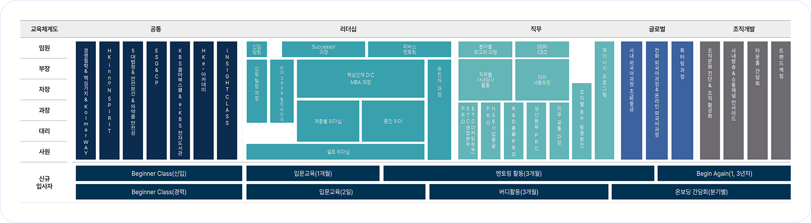- 입문교육 : 신규 및 경력 입사자가 조직에 잘 적응할 수 있도록 업무에 필요한 지식이나 기술 등을 안내·교육하는 온보딩 프로그램 및 소프트랜딩 교육, 신입사원 대상 멘토링 프로그램과 경력사원 대상 버디 활동, 경력 입사자 대상 Mid-career 리더십 특강, 리텐션 교육을 운영하여 임직원의 소속감 향상 및 동기부여 기회를 지속적으로 제공합니다.