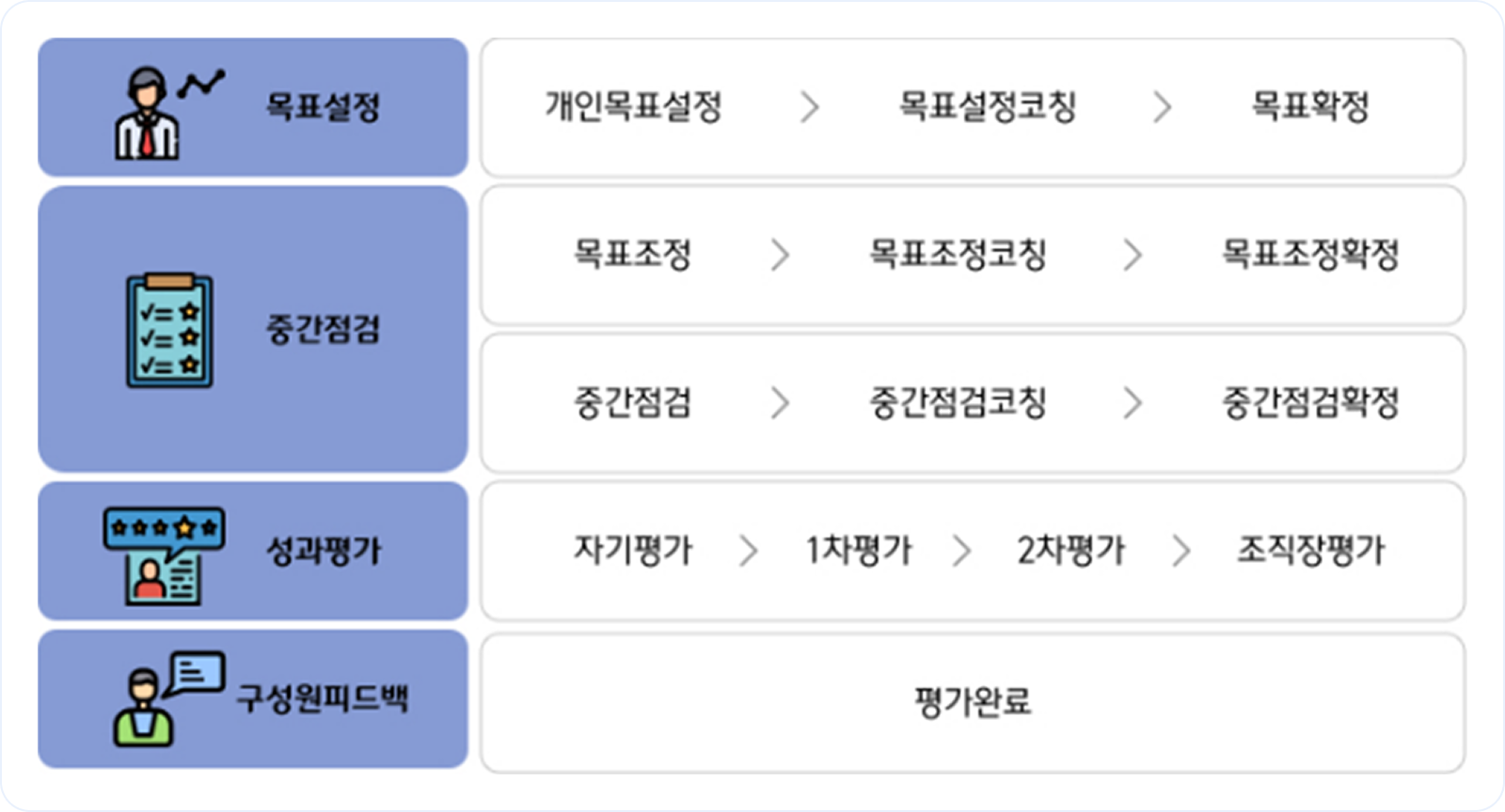 임직원은 조직 핵심성과지표(KPI)와 연계된 개인 업적·역량 목표를 수립하고, 목표 달성에 대한 자기평가를 진행하며 평가자는 이를 바탕으로 종합적인 평가와 피드백을 제공합니다. 임직원이 평가자의 평가 결과에 대하여 이의가 있는 경우 ‘오픈도어’라는 심의·조정 절차를 거침으로써, 공정성과 투명성을 확보하고 있습니다.