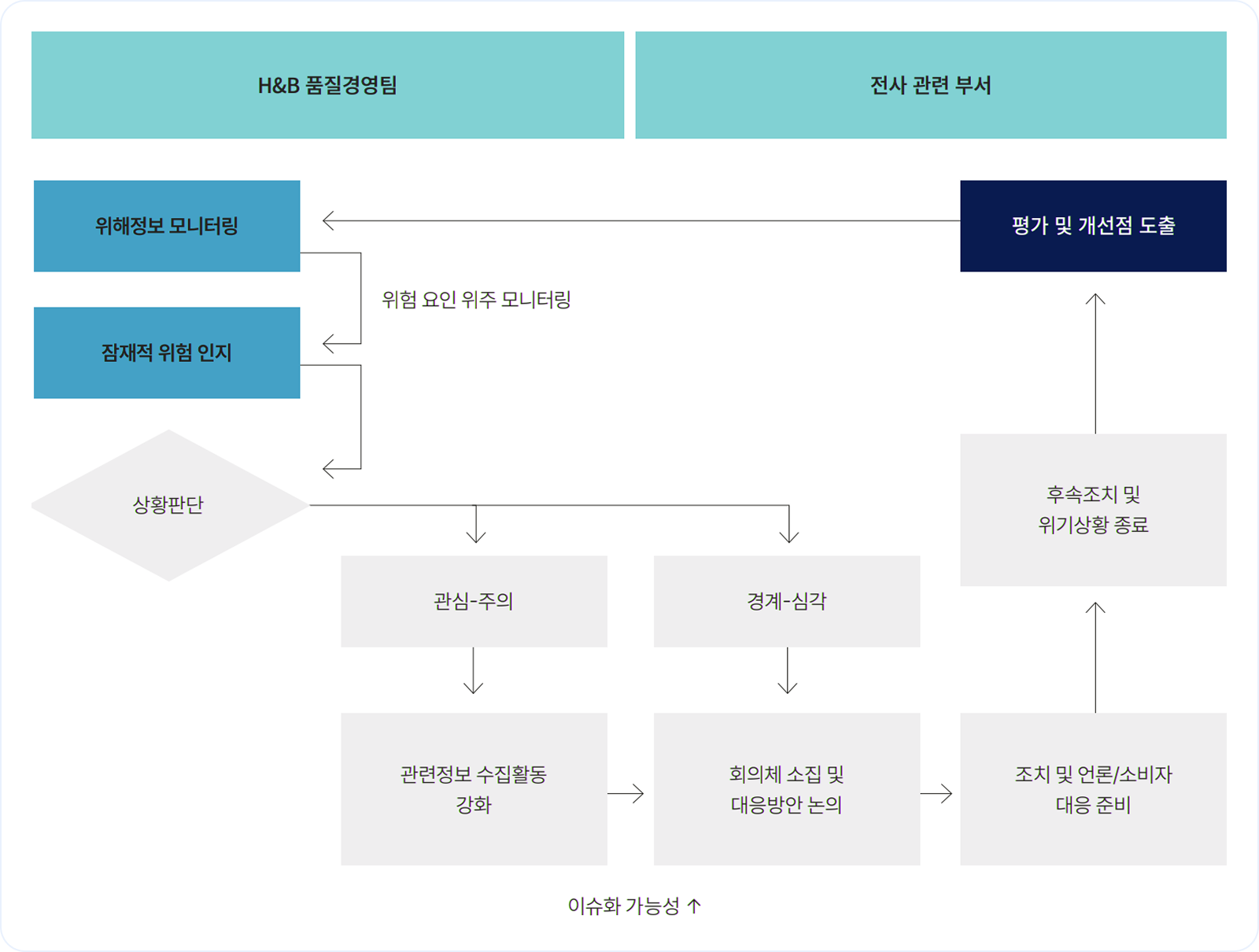 또한 식품 등 이슈에 대한 예방·대비 태세를 사전에 구축하고 신속한 대응을 통하여 유연하게 위험에 대처할 수 있도록 ‘품질 이슈 대응 프로세스’를 운영합니다. 이에 따라 전방위적 정보 수집을 통하여 이슈 요인을 조기에 발견하고 대처합니다.
