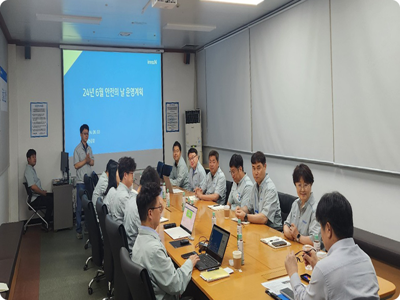 HK inno.N은 임직원의 안전문화 내재화를 위한 다양한 활동을 진행합니다. 대표이사 주관으로 매월 사업장에서는 '안전의 날'을 진행하여 안전경영 메시지를 전달하고 안전한 작업수칙에 대해 정기적으로 강조하며, 현장 점검 및 임직원과의 소통을 통하여 안전한 작업환경을 구축하고자 노력합니다.